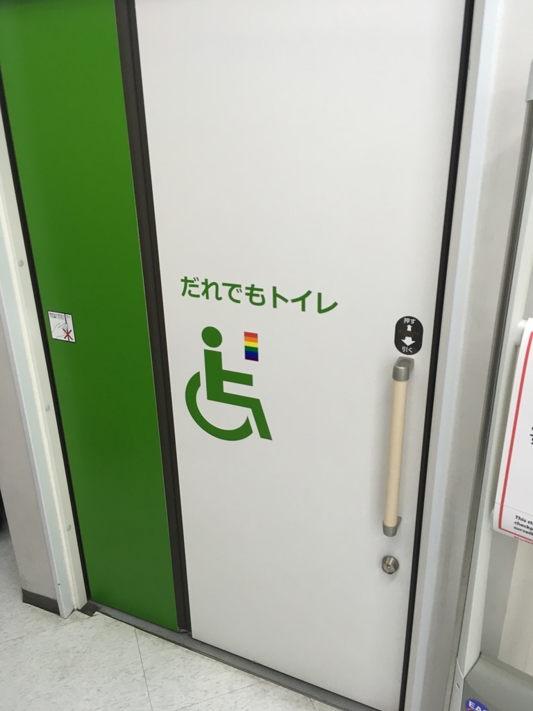 写真17:名古屋駅ちかくの家電量販店の「だれでもトイレ」。車いすマークとレインボーマークが。